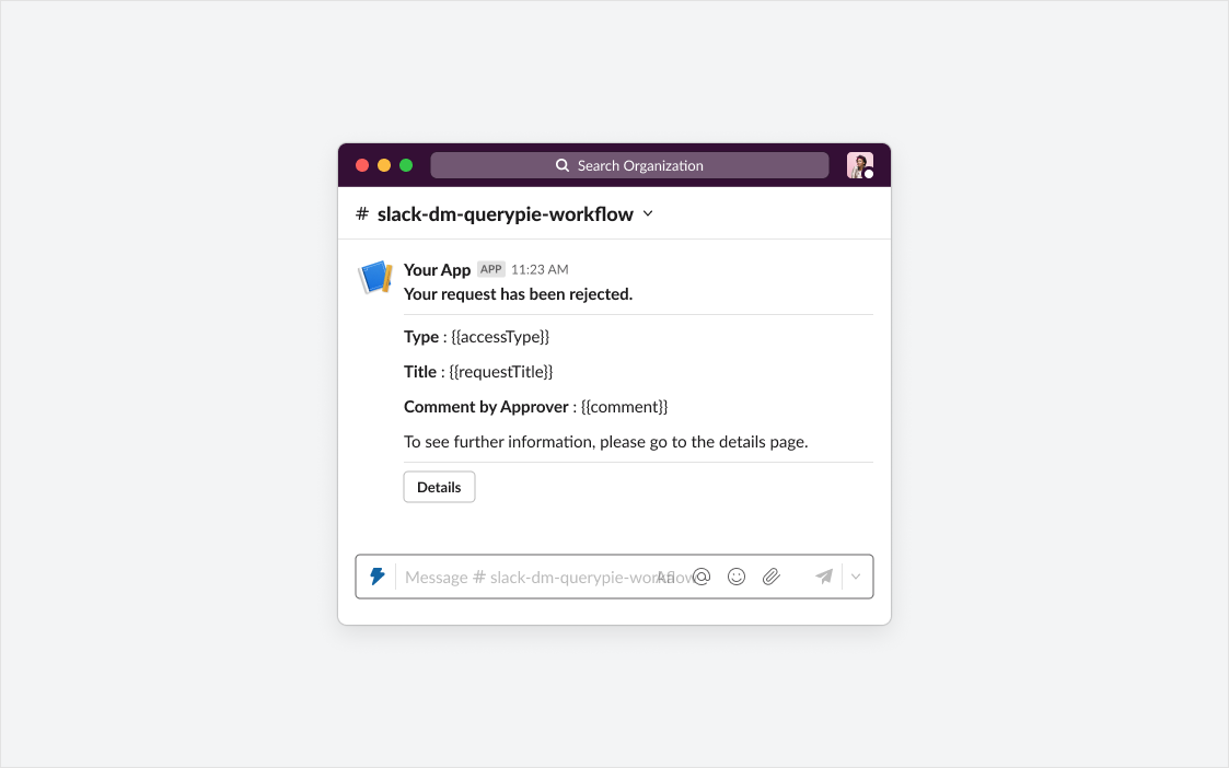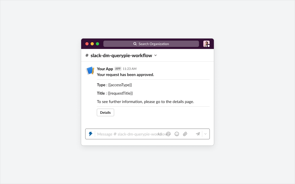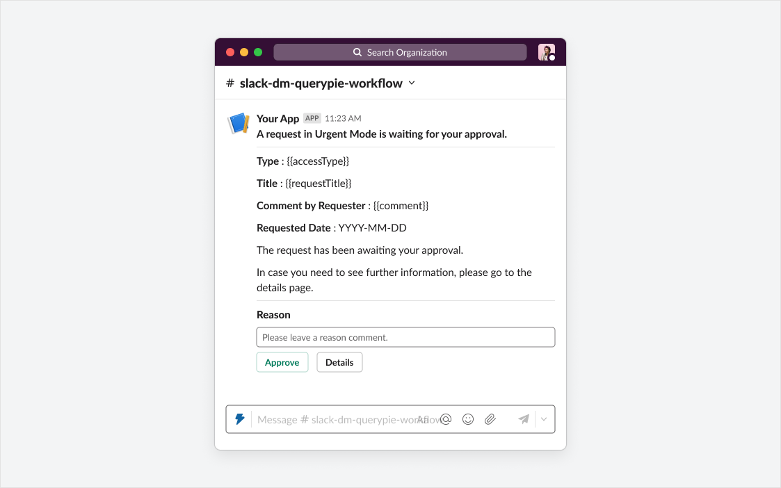 QueryPie 관리자의 사전 설정에 따라, 메시지를 받은 승인자는 Slack에서 승인/반려를 할 수도 있습니다. 필요한 설정은 상단의 ‘Slack DM 설정하기’를 확인해주세요. 액션 버튼이 없을지라도 Details 버튼은 항상 포함됩니다. 해당 버튼 클릭시, 웹브라우저가 실행되어 QueryPie 로그인 창이 나타납니다. 로그인 성공시 Workflow 디테일페이지로 이동합니다.