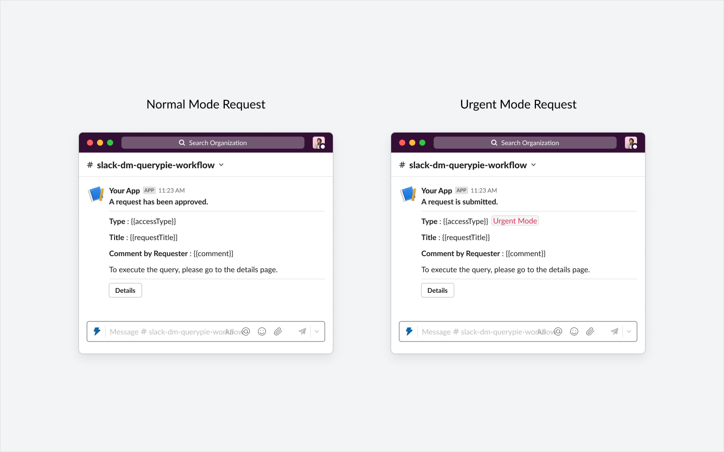 별도의 액션 버튼은 포함되지 않으며, Details 버튼이 포함됩니다. 해당 버튼 클릭시, 웹브라우저가 실행되어 QueryPie 로그인 창이 나타납니다. 로그인 성공시 Workflow 디테일페이지로 이동합니다.