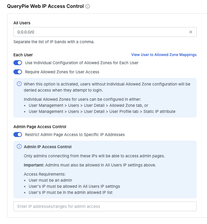 이 옵션을 활성화하면, 개별 IP 허용 영역(Allowed Zone)이 설정되지 않은 사용자는 QueryPie에 로그인할 수 없습니다. 로그인 페이지 접근은 가능하지만, 로그인 시도가 차단됩니다.